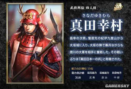 真田幸村(1567-1615)是日本战国末期名将,真田幸隆之孙,真田昌幸之次子,真田信幸之弟。关原合战与父亲同在西军,战后被流放于纪伊九度山,逃脱后,投奔到大坂城。在大坂夏之阵中率士兵与德川家康的大军浴血奋战,最终寡不敌众,战死。与源平合战的源义经、南北朝时代的楠木正成并列为日本史中“三大末代悲剧英雄”。