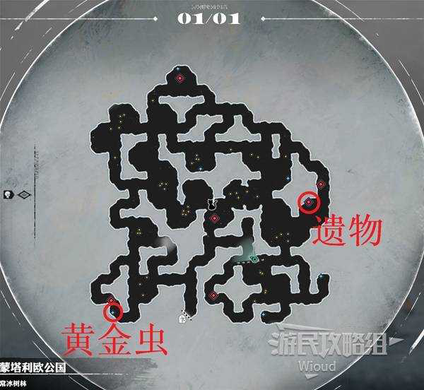 进入森林先去地图的左下角拾取【黄金虫】,地图右上角画圈的指引点有一个宝箱,可以获得此地图的遗物。