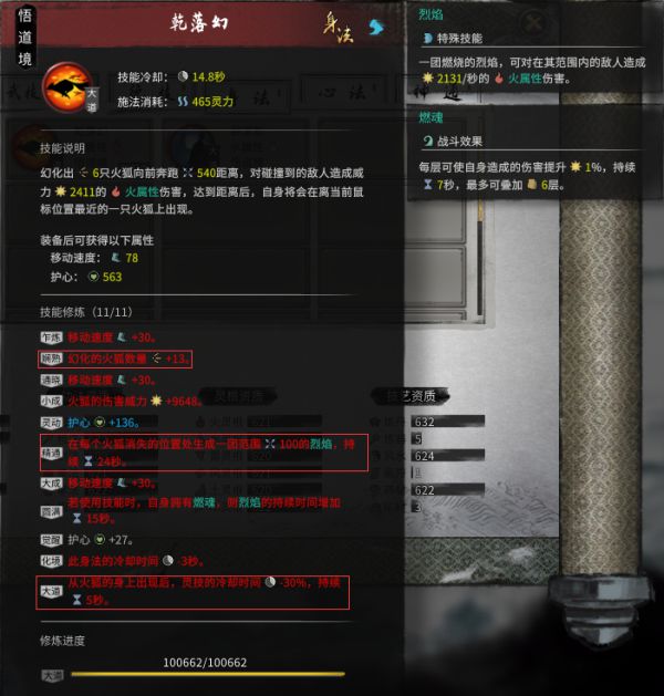 身法选择火身法(减少左键CD;增加烈焰增伤;若有火狐威力词条,可当做伤害技能,经实测爆发200W左右伤害)
