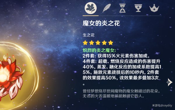 圣遗物:魔女一套,沙漏选择攻击,杯子火伤,帽子爆伤。