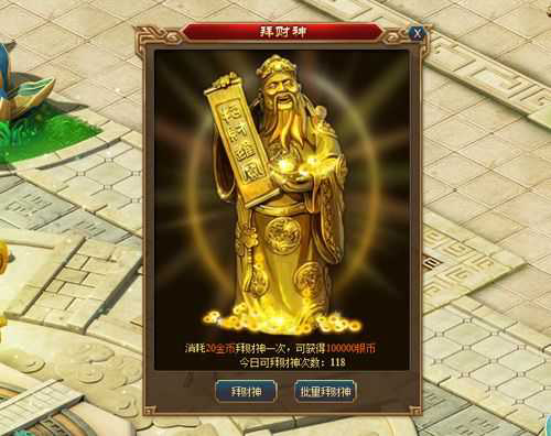 大家可以从游戏界面右上方的“拜财神”进入拜财神功能,前10次只需消耗5金币,便可兑换10万银币。使用“批量拜财神”功能更可一次性拜祭财神10次,真是简单快捷。