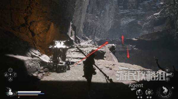 不白打到一半会逃走,不白逃走后,先不进洞去追。从旁边山崖跳下去,下面有隐藏的空间可探索。
