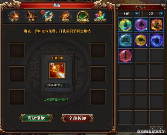 三颗相同种类宝石可以合成一颗高级宝石,宝石镶嵌时等级不能高于装备强化等级。每件装备自带2个镶嵌孔,同时最多可开启6个镶嵌孔,开启新的镶嵌孔需要使用道具金刚钻,金刚钻的获取来源有跑商,跑商投资,客栈大宴宾客等。