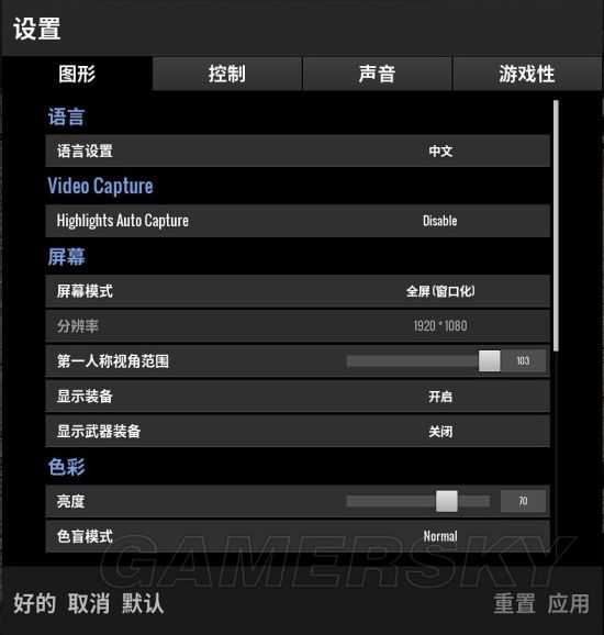 在这里为了追求更高的流畅度,我把大部分画面设置都调成了最低。但为了在跳伞快落地时更早的看到地上的东西,可以将可视距离调为高。纹理调成高可以令人看东西更清晰更舒服。开动态模糊的原因是,在刷新率较低的时候,使我的画面看起来更连贯,游戏体验更佳。