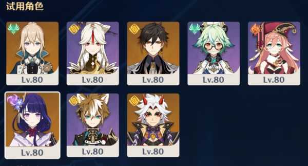 本次挑战的试用角色如下:角色等级均为80级,天赋根据自己所拥有角色与否的天赋等级(默认888),命之座根据自己所拥有角色的命之座(默认为0),武器及圣遗物由系统提供。
