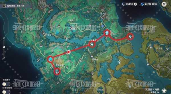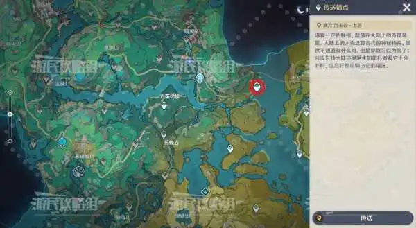 后面的任务可以先不用做,只要解锁沉玉谷地图即可,沿路往前开启七天神像。然后继续往河对岸走,沿途开启路上的传送锚点,从传送锚点的位置往对面的瀑布位置走,瀑布下方有沉玉谷金鲤新机关(下图星标位置)。利用金鲤机关快速爬上高山。