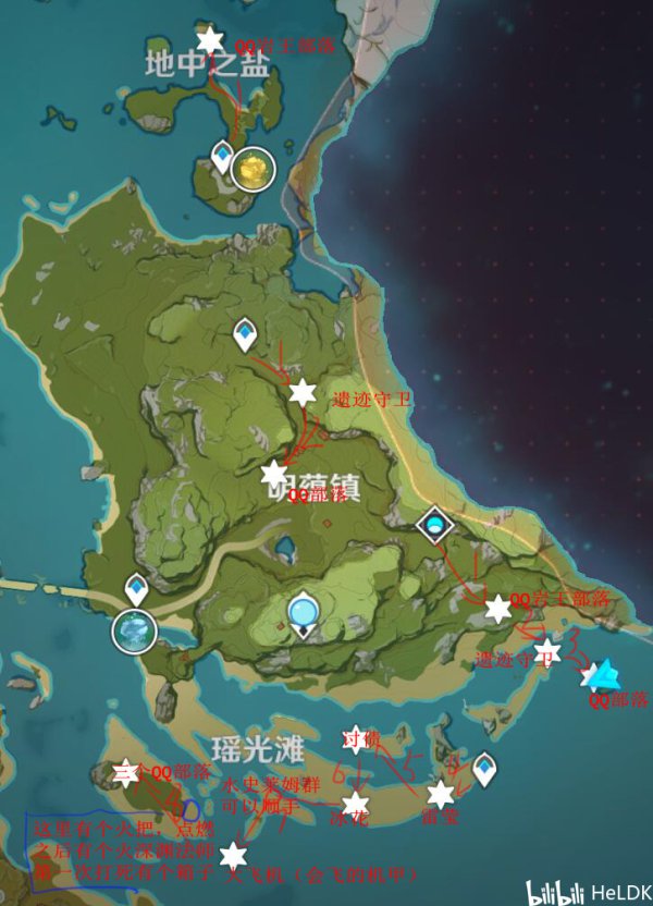 - 村和部落:就是成群出现的丘丘人,一般由一只大的(丘丘暴徒)和几只小的(丘丘人)组成,有的时候也会是一只深渊法师和一只萨满带队,有丘丘岩王所在的部落我会直接标注岩王。