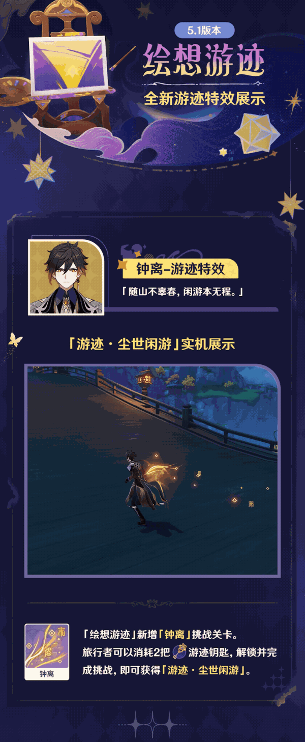 《原神》5.1版本更新后,「绘想游迹」玩法将新增钟离和刻晴的挑战关卡,以及同角色对应的「游迹·尘世闲游」和「游迹·霆霓快雨」游迹特效,想要了解的话请看下面的介绍,希望能够帮助大家。
