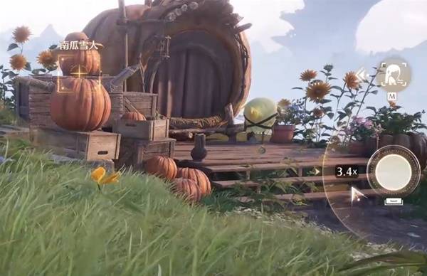 与晒晒对话,利用错位拍摄一张用南瓜组成的雪人照片,位置如图所示,拍好后交给晒晒即可~