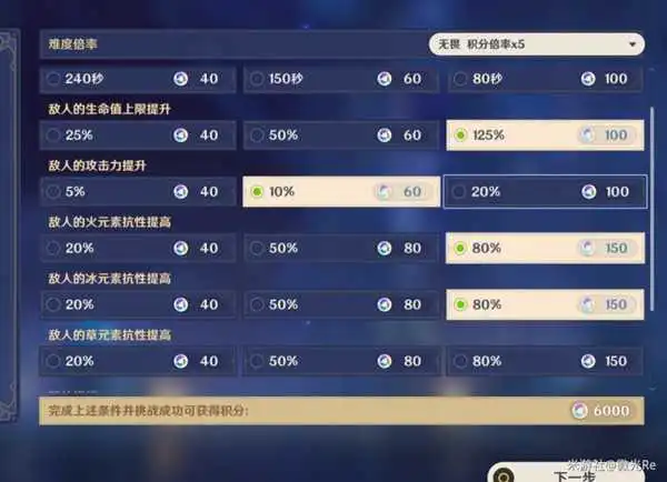 时间不选,生命拉满,攻击选10%,火抗拉满,冰抗拉满,草抗不选,最后三个敌方增幅选前两个。