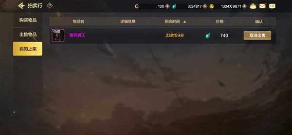 首先,我们从主界面的上方可以看到拍卖行,当我们打开拍卖行时可以看到拍卖行分为购买物品、出售物品和我的上架三个功能,顾名思义三个功能分别是用于购买道具、出售道具和查看出售列表的。