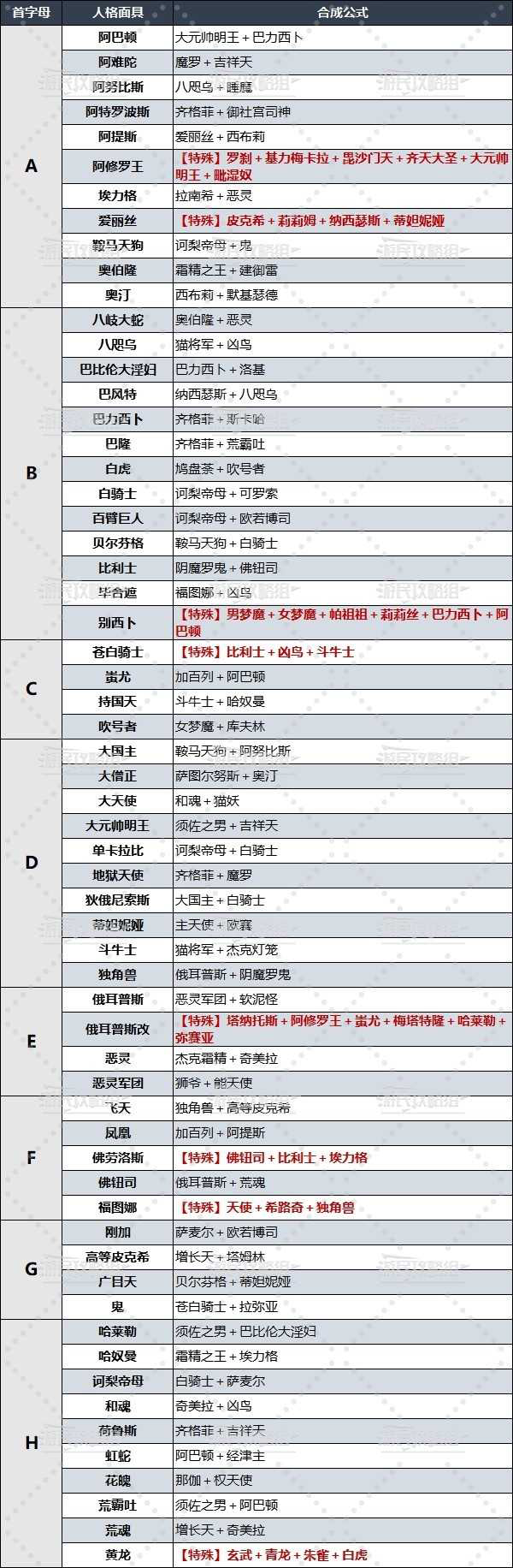 《女神异闻录3Reload(P3RE)》中玩家可以使用特定面具来合成新的面具,合成新面具不仅可以解锁图鉴,还能获得奖励。下面就为大家带来《女神异闻录3Reload(P3RE)》全人格面具合成表,希望对大家有所帮助。