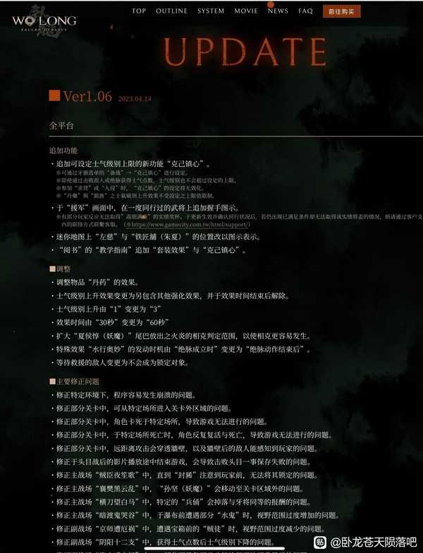 《卧龙苍天陨落》1.06版本即将更新,在1.06版本官方做出了许多调整,下面请看玩家“Innaer”带来的《卧龙苍天陨落》1.06版本更新内容一览,希望能帮助到大家。