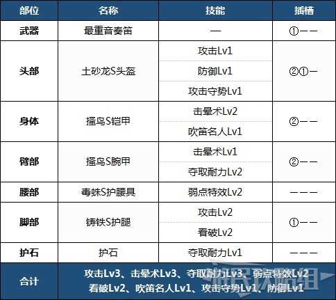 可发动狩猎笛必备技能【吹笛名人】,以强化攻击力为核心的配装。