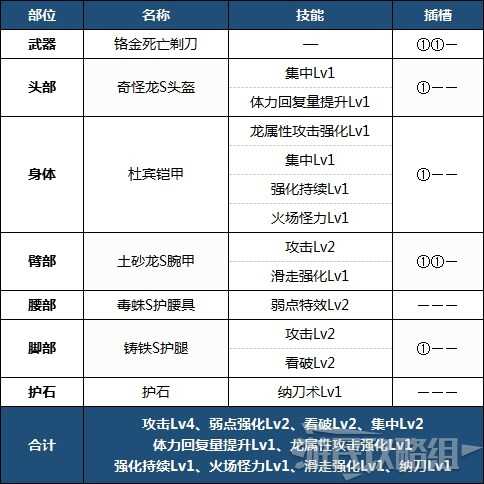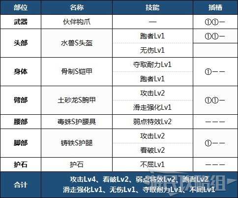 跑者可以用于维持鬼人状态,同时攻击、看破和弱点特效可以增强输出。如果不需要【跑者】的话,可以更改头部和身体的防具以强化攻击技能或属性攻击技能。
