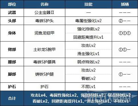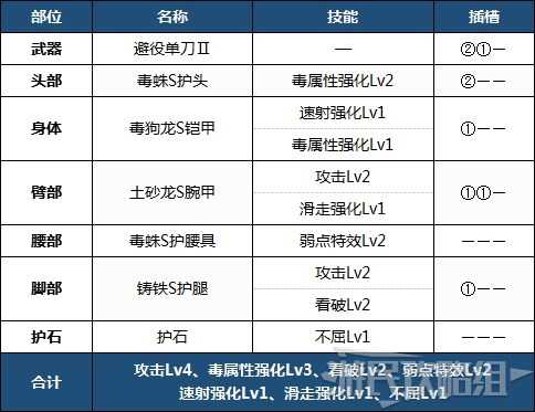 强化了毒攻击的单手剑配装。由于搭配了攻击、看破和弱点特效,所以攻击能力也比较强。