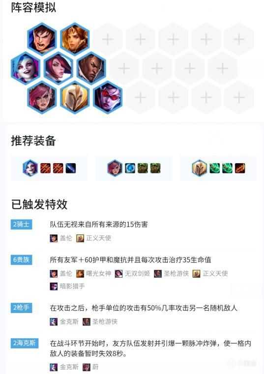 由于版本更新,贵族羁绊提升了护甲魔抗60>70。以及法师虚空的小削弱,六贵族可以给阵容提供不错的坦度,保证金克斯的输出,而缺点是成型满,所需要人口多。