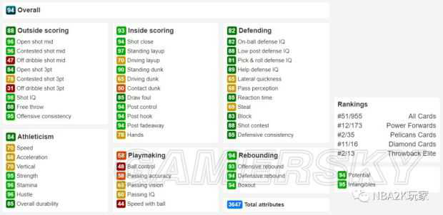 韦斯特相信看球的朋友都很熟悉了,随勇士连夺两冠后,38岁的韦斯特于今年8月30日宣布正式退役;不懈追逐冠军的他终于在自己NBA职业生涯末两年达成了心愿;这张韦斯特钻卡取自他处于奥尔良黄蜂的时期,当年与蜂王保罗一起驰骋赛场的男人解甲归田了。这张卡的属性总值为3647,目前在所有钻卡中排在第11位;六大项中有两项高光,三项绿区和一项红区。进攻端内外线得分能力都不错,内线进攻除了拥有上篮扣篮能力之外,背身三项均给到了94;外线空位三分也有着84的数值。防守端的表现作为一张钻卡大前来说虽然算不上突出,但也比较合格,横移65对位内线球员时基本跟得上,篮板属性均在94左右。这张卡的身高为206CM,模型过关,打大前不占优势但也不会太吃亏,打中锋就有些太勉强了。总的来说这张韦斯特作为一张内线可刚、外线可投的大前来说,还是比较实用的。