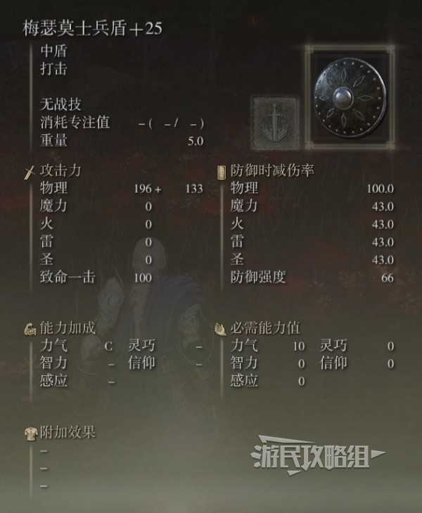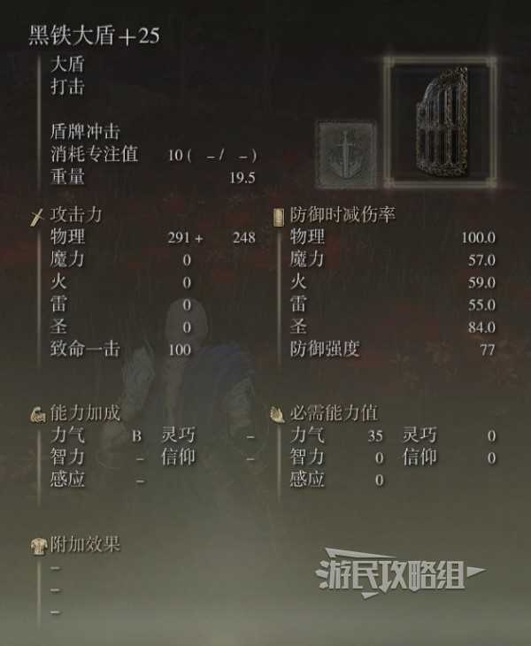 重量5,防护强度为54,比本篇中的蓝金鸢形盾属性要高一些。如果不想让盾牌占太多负重的话,可以考虑使用。