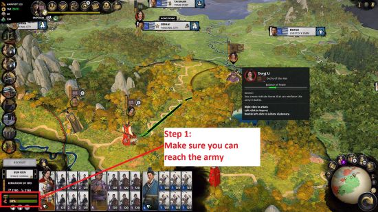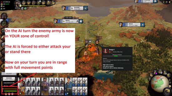 神奇的操作来了:下命令攻击敌方部队,在走入敌方控制区但没有接战的时候按下退格键,你会发现部队停在敌方控制区内了!此时点下一回合,敌方在逃部队就反过来在你的控制区内了。他只能进攻你的部队、不动或者原地解散。如果他不动,你下一回合进攻即可,他只能逃跑一次,你有足够的行动点追上他。