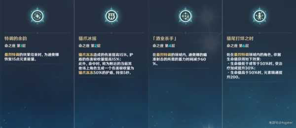 迪奥娜的1命可以加速元素爆发的循环积累;第2命座提高盾量,且在联机时的效果更为优秀;第3、5命座分别提升元素爆发和元素战技的技能等级,而在解锁第5命座后,迪奥娜的护盾可以进一步提升盾量;第6命座可以为生命高于50%的场上角色在元素爆发范围内提高200精通,进一步增加队伍中输出角色的反应伤害。