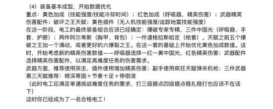 此时电工应该可以达到速杀世界五普通具名敌人小队(除肉盾)的要求,这时,你应该已经有了自己的配装思路,并掌握了电工技能的使用。