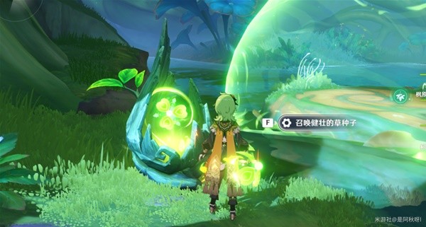 拿上种子,攻击屏障上方位置草机关后,出现新的三个草机关,继续攻击中间那个。