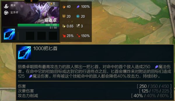 丽桑卓解读:丽桑卓定位高单伤害低群伤,群体控制。面板属性在1费中比薇恩略高,低攻击力,其他为常规后排属性双抗、与攻速、攻击距离。丽桑卓还是老技能1000把匕首,高单伤、低群伤且还能全体降低攻击力。羁绊上复苏者能增加回蓝,而魔女羁绊只有在充当魔女首领时才能收益大些,增加50%法强,携带法爆也能打出1368的单伤,684的群伤。法力值只有50还有魔女羁绊回蓝棋子可开发度还是不错。