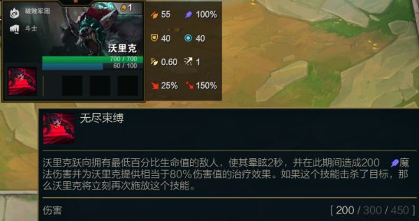 沃里克解读:狼人定位单体爆发输出坦,面板属性中规中矩。技能上单体控制,中等伤害,但会拥有80%技能回血,如果杀死目标还能继续释放技能。