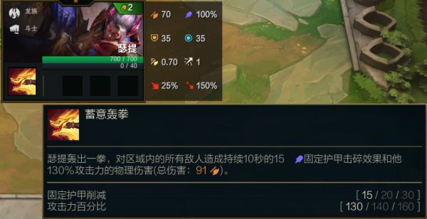 瑟提解读:瑟提定位前排输出、辅助副坦,面板属性在2费前排输出中比较高。技能上超上时间护甲击碎,低伤害群伤。