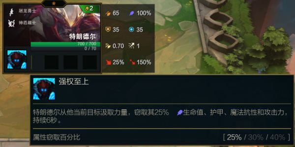 特朗德尔解读:巨魔定位功能性坦。面板属性2费坦上中等。技能比较有意思有点像之前赛季的劫吸取攻击力,而巨魔是生命、护甲、魔抗、攻击力全部吸取,还有个不同的是有持续时间6秒。