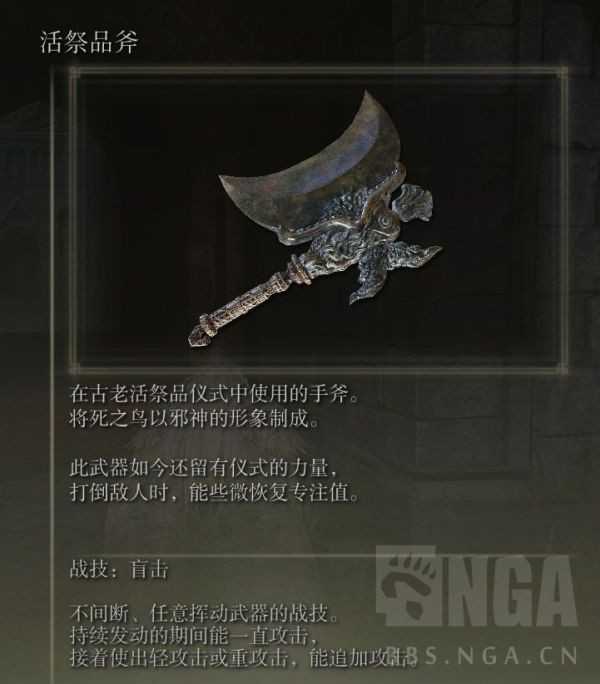 这把斧子拥有着击杀敌人回复专注值的效果,打倒一个敌人肉眼可见蓝条增长一截,只要装备在副手,即使不是用斧子击杀也会获得回复效果,比如左手活祭品斧,释放右手的名刀月隐战技能,打倒敌人就能回蓝。