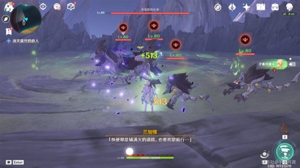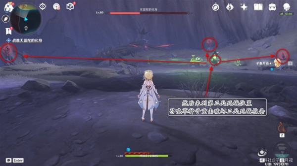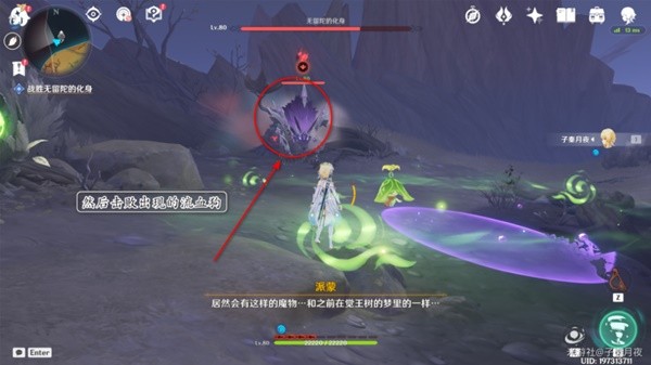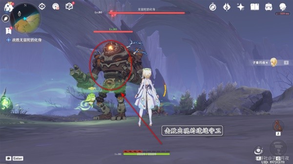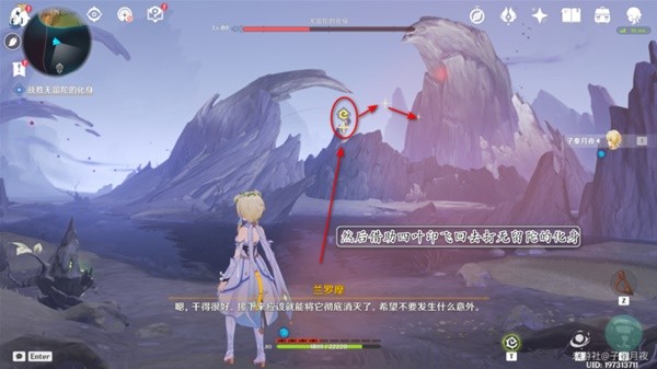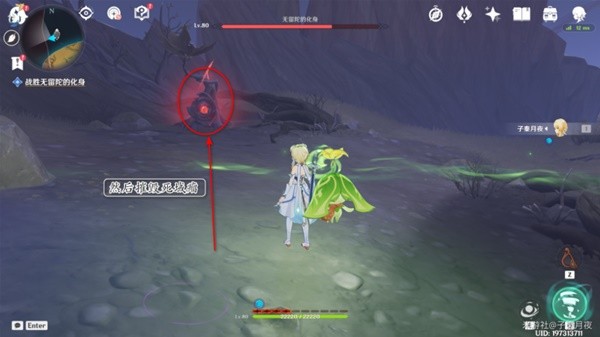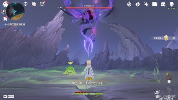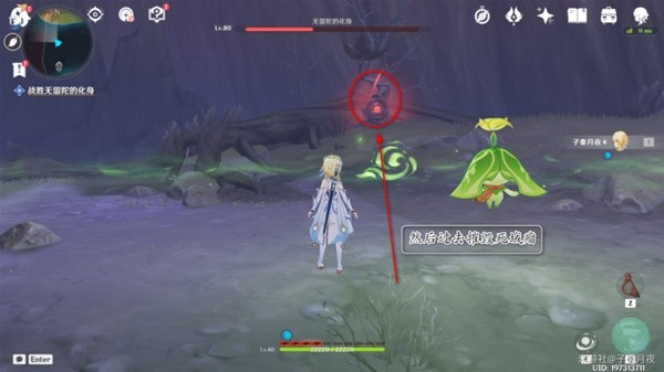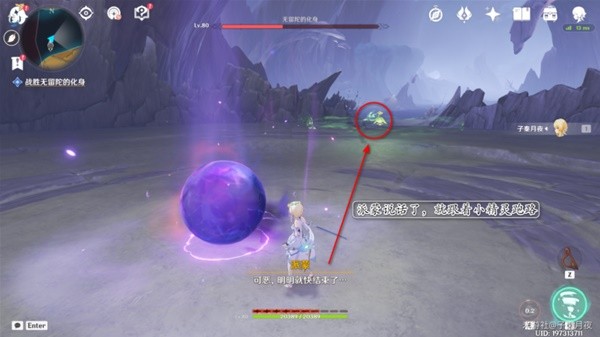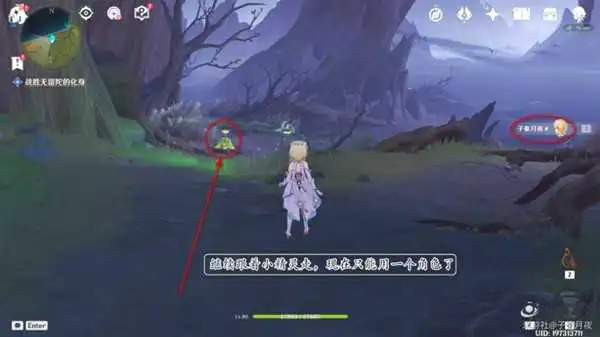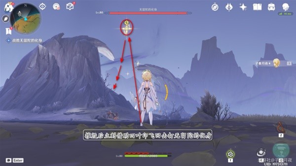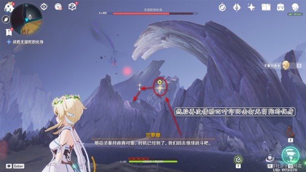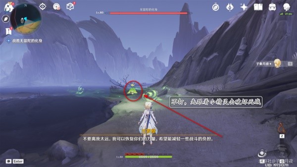 9.打了三分之一血,无留陀的化身要起来了,派蒙提醒我们赶紧跟着小精灵跑路。