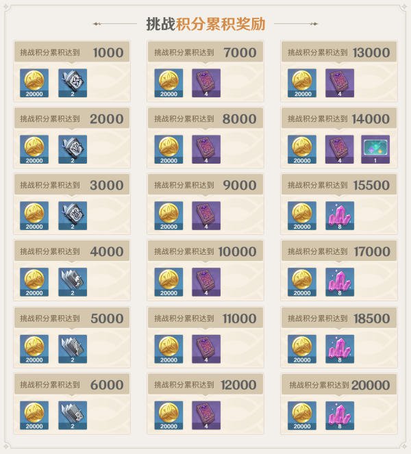 「无相交响诗」活动获取所有奖励需要总分达到20000分。奖励为【摩拉】、【大英雄的经验】、【精锻用魔矿】、【天赋升级材料】(蓝色)、【名片】