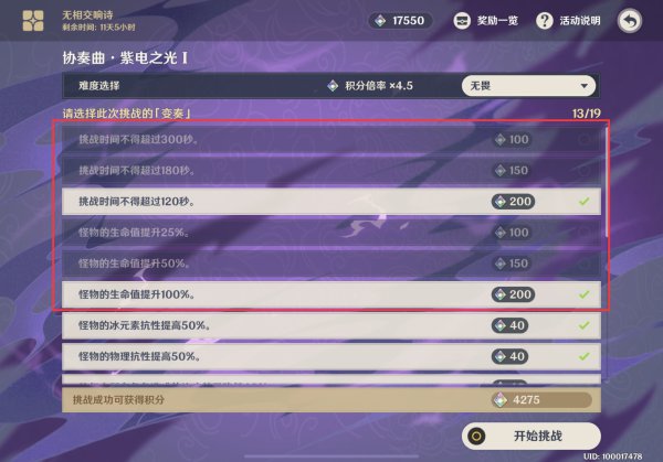 关卡的分数计算规则为当前选择的「变奏」的基础积分*难度的积分倍率,其中「挑战时间」和「怪物生命值」这两类「变奏」同时只能各自生效一个档位。