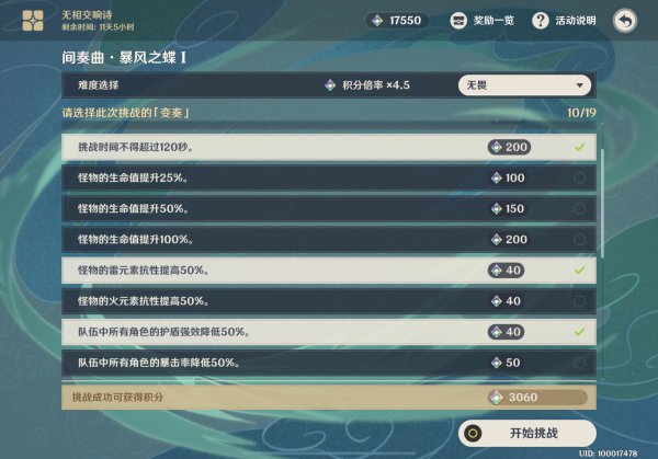 只是为了拿全奖励又不想打得辛苦的旅行者建议选择「无畏」难度并且勾选除了「怪物的生命值提升」、「怪物的属性抗性提高」(如果正好是自身培养的角色的输出属性的话)、「队伍中所有角色的暴击率降低」、「队伍中所有角色的暴击伤害降低」这四种以外带有增加难度效果的全部「变奏」,这样即使是最麻烦的情况下每关的通关均分也都为3000分以上。