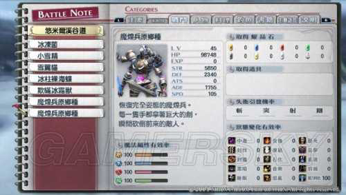 继续下山一小段路发生剧情,杂鱼战,战后开放战斗笔记,里面收录各种曾经战斗过的魔兽资料,要完全记录魔兽资料需要使用 战斗探测器/バトルスコープ 或相关的术技、魔法进行探测来获取,以后多多养成第一时间解析敌人的习惯