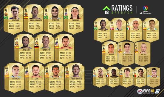 《FIFA18》 UT模式冬季球员数据更新西甲联赛球员公布!本次的冬季数据更新是根据各支球队的球员在上半赛季的表现而进行变更的,所有更新球员数据总评只升不降。值得一提的是,本次数据更新C罗梅西没有变化。