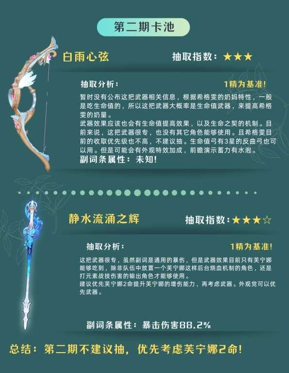 对于抽取希格雯的玩家,目前来说,生命弓只有一把3星的反曲弓,专武也大概率是一把生命弓非必要抽。对于外观有追求的玩家,有一点需要注意,那就是在前瞻演示中,专武一直蓄力是有水泡特效的,不知道是不是跟仆人武器一样专有的特效,所以追求外观毕业,可能还会需要专武。