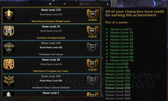 最后是大家比较关心的小号神器威望配色问题。在荣誉等级成为账号共享的蓝边成就后,达到新荣誉等级10,30,50,80会分别解锁威望外观及其三个配色。同时通过OverAchiever插件可以看到新荣誉上限是500级,奖励坐骑声威血缚骏马。