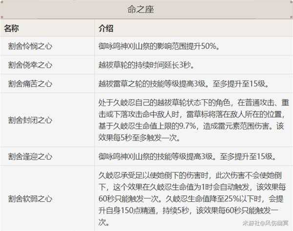 四命:在【E技能】状态下的角色,每5秒普攻项命中会在该位置根据久岐忍生命值造成【雷范围伤害】。