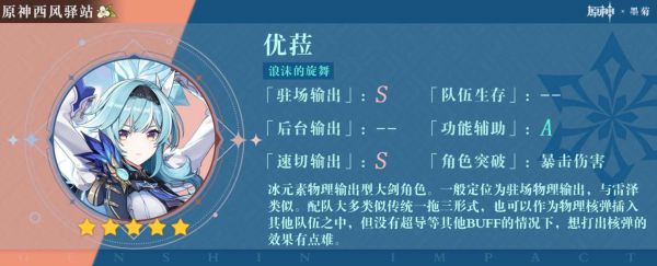 优菈的爆发流程在加成上满后可以自行完成,更看重其他角色的辅助能力,当然也可以将优菈作为减少冰元素抗性的一种手段,个人认为优菈配队还是比较灵活的,但只是当作减抗手段实在是有些浪费了呢~