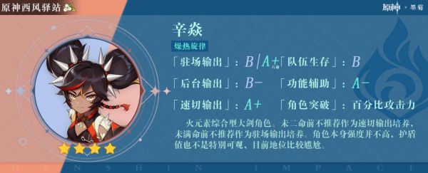 在没有命座时,辛焱不是一名适合输出的角色,即使作为辅助,护盾量其实不太够看,增加的物伤也平平无奇,因此,辛焱没有命座时不推荐投入资源哦~相反的,如果有满命辛焱而且有合适的大剑,可以考虑练一下这个热爱音乐的街头少女~