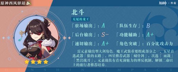 北斗开启元素爆发所需能量非常高,没有双雷的队伍不是很推荐单独搭配北斗,无论是现在兴起的烟绯超载队还是经典的魔王武装队里,都有菲谢尔为其弥补充能上的弱势,她的弱势从此就可以窥见一斑了。