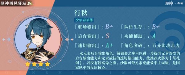 「元素爆发」可以为驻场角色提供较高的伤害减免,配合行秋的减伤可以肉身抗住大部分伤害,群怪情况下能有较高的总体倍率,没二命的情况下对群效果略差,建议开启二命后再着手培养较佳。