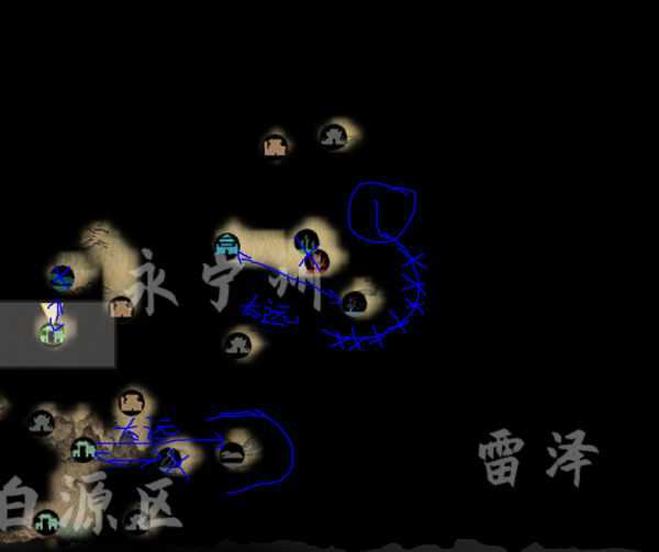 我用线条标注出来我觉的城镇的大概方位,其中一个线条打了XX 那是因为这个XX我没记错的话 是永宁州边界线 城镇刷不到边界线以外的地方,所以他大概率在圈圈左右。