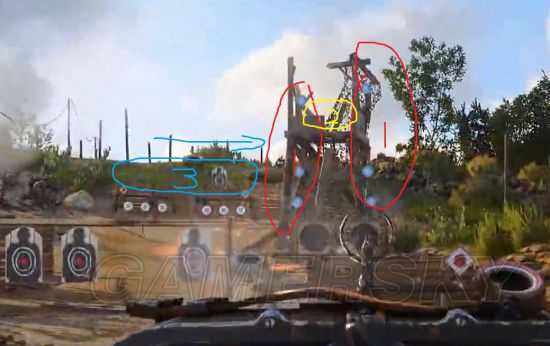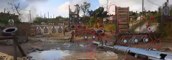 靶场的第三个挑战,如图,首先需要击中箭头所示的4个靶子,然后会出现3个靶子,击中3个靶子后,又会出现4个靶子,最后会出现单独的一个靶子,击倒这个靶子后,会在附近出现1个飞盘,你要在飞盘落地前击中,击中后依次会出现两个飞盘,然后三个飞盘,全部击中后解锁,靶场全场会放烟花。