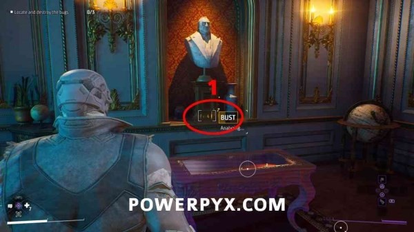 按【十字键-下】使用AR扫描三处窃听器,第一个在门右侧半身像的下方,分析并与之互动即可破坏。