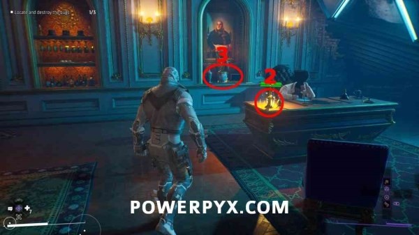 第二个在企鹅人办公桌的台灯里,扫描并与之互动。第三个在企鹅人后方,就在画像下面。破坏所有窃听器后,从企鹅人身后的架子上拿起威士忌可触发另一段动画,推动任务继续,并触发另一个谜题(用两根隐藏电线开启装置)。
