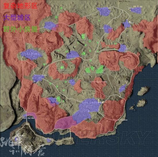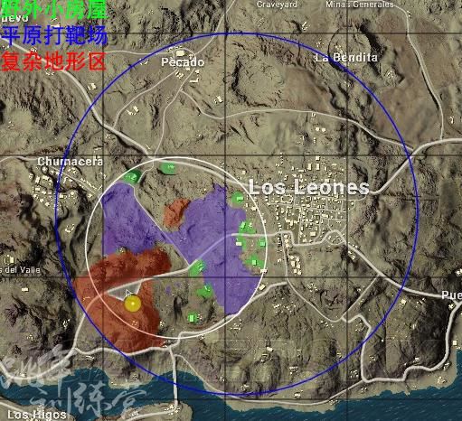 首先,由于新地图面积较大,资源点分布较为分散,地形复杂,所以小编在此将地图分为四个较大的板块,分别是复杂地形区、大型城区、平原打靶场和野外房区。这四种不同的地形特点,面对的情况大不相同,而打法也就有所区别了。